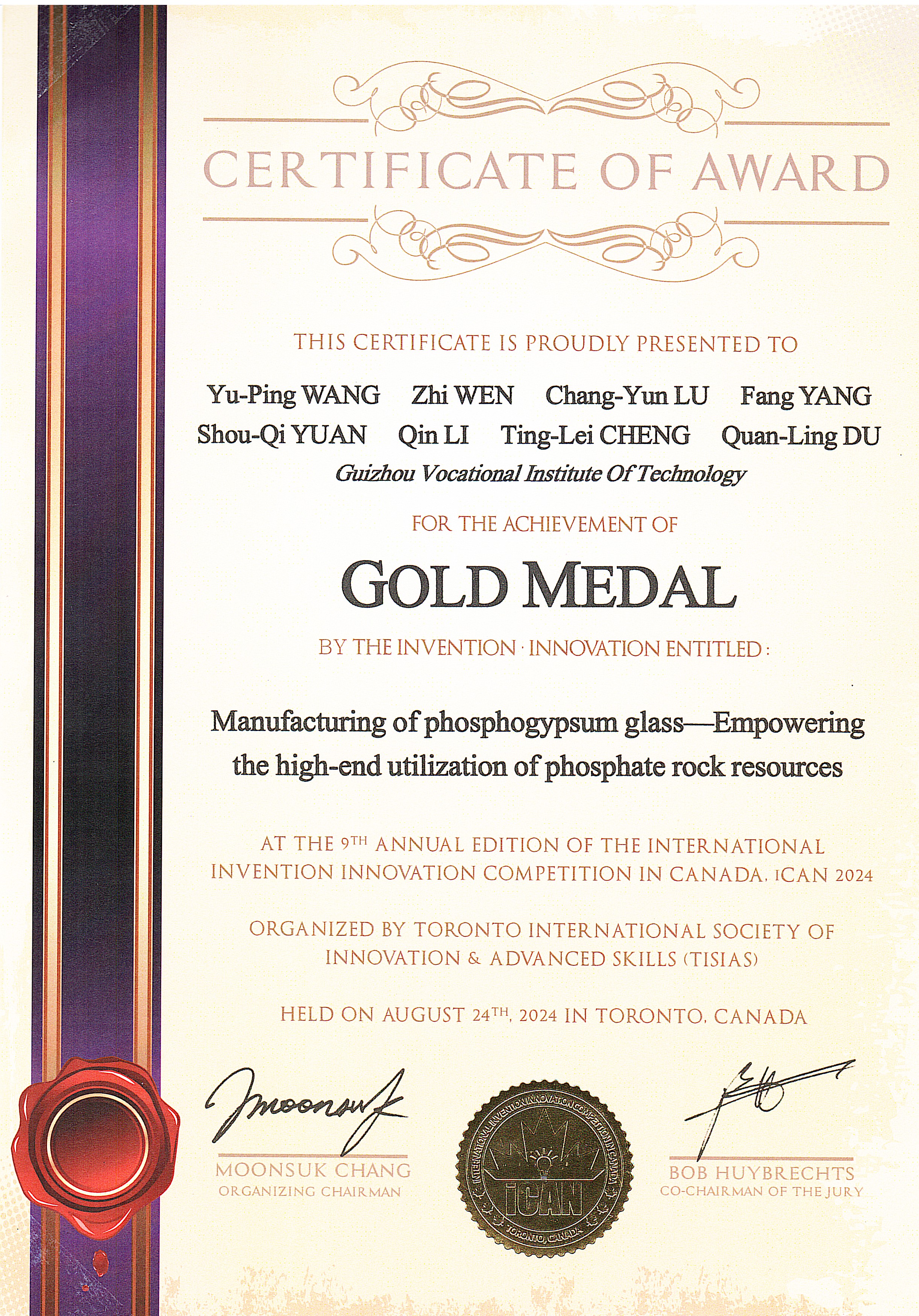 贵州应用技术职业学院王裕平、文智、卢昌云、杨芳、袁寿奇、李芹、程廷蕾、杜全玲等教师于2024年7月底集体提交的《Manufacturing of phosphogypsum glass—Empowering the high-end utilization of phosphate rock resources》(Inventors:Yu-Ping WANG; Zhi WEN; Chang-Yun LU; Fang YANG; Shou-Qi YUAN; Qin LI; Ting-Lei CHENG; Quan-Ling DU)项目,经过大赛评委专家一个多月的评审,斩获“金牌”。