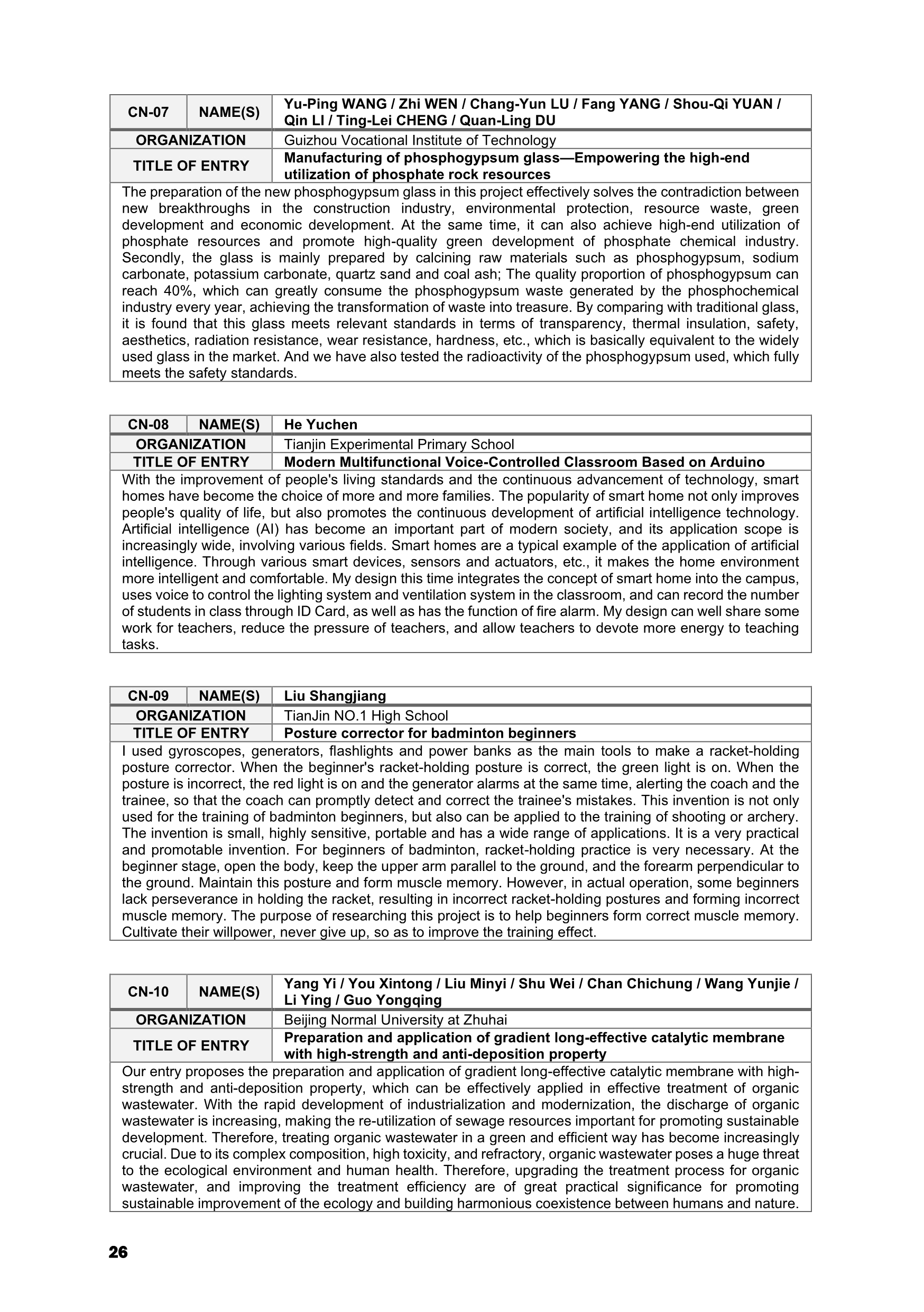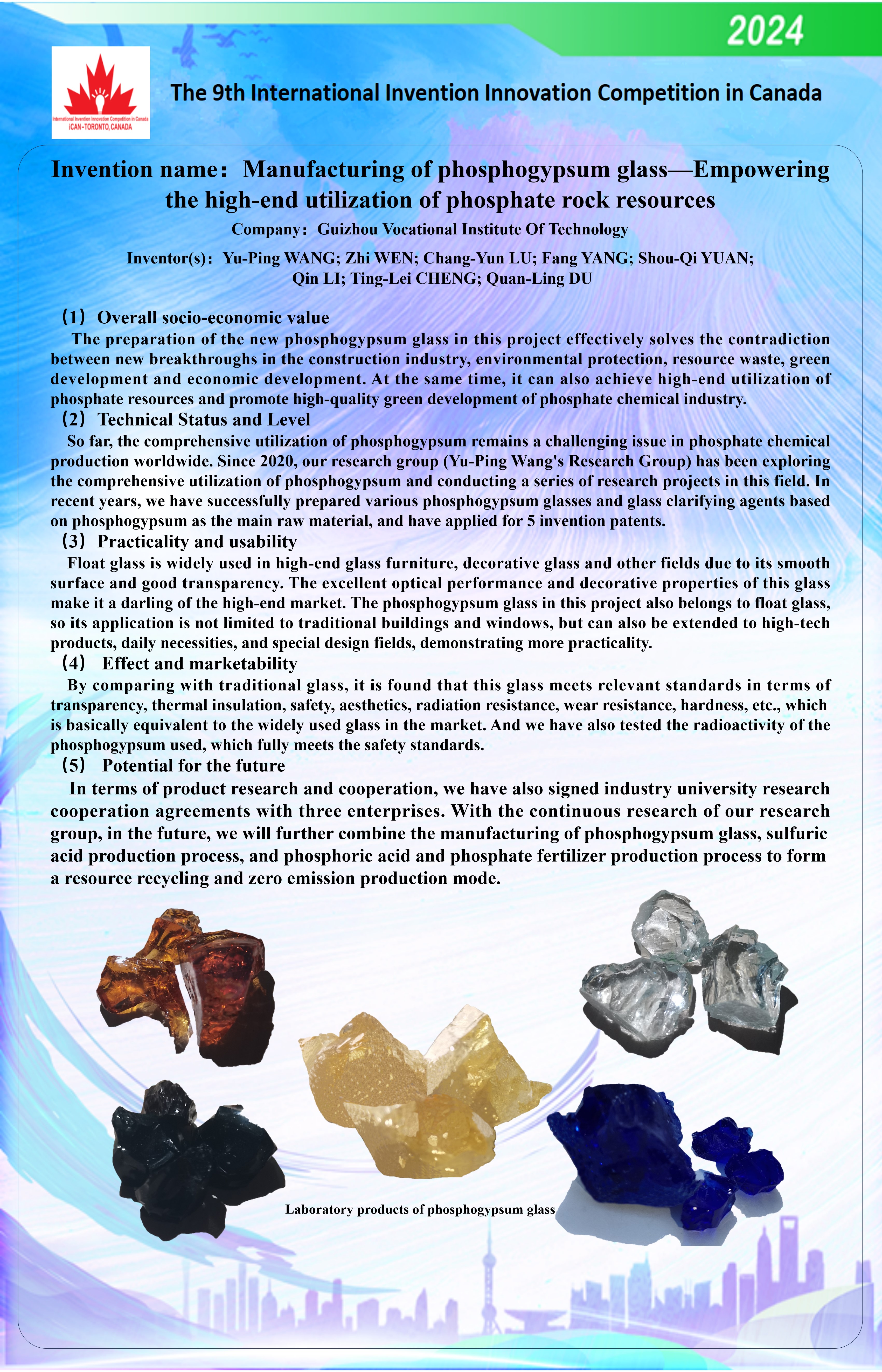 以下为《Manufacturing of phosphogypsum glass—Empowering the high-end utilization of phosphate rock resources》项目在本次大赛中的基本信息简介,具体详细信息可参见以下附件:The 9th international invention innovation Competition in canada(page 26).